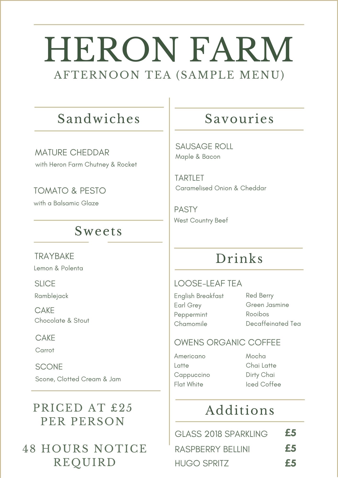 A minimum of 48 hours notice is required.  Please include any dietary requirements at the time of booking as each of our afternoon teas is individual made to your needs by our chefs to ensure you have the perfect experience.  Priced at £25 per person including a hot drink.