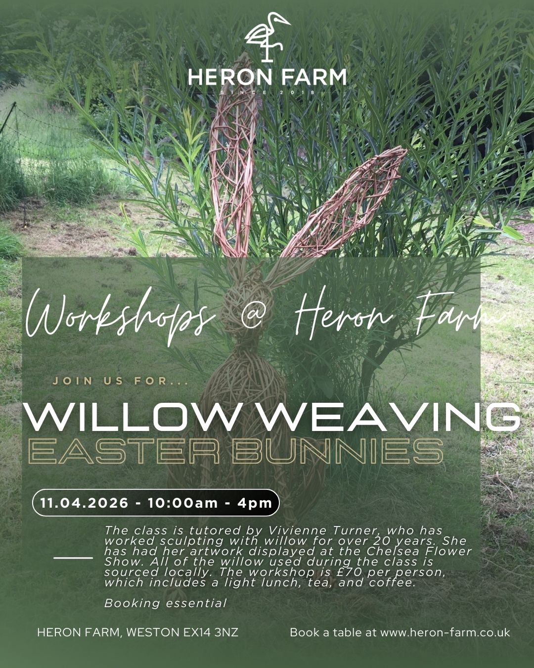 The class is tutored by Vivienne Turner, who has worked sculpting with willow for over 20 years. She has had her artwork displayed at the Chelsea Flower Show. All of the willow used during the class is sourced locally. The workshop is £70 per person, which includes a light lunch, tea, and coffee.